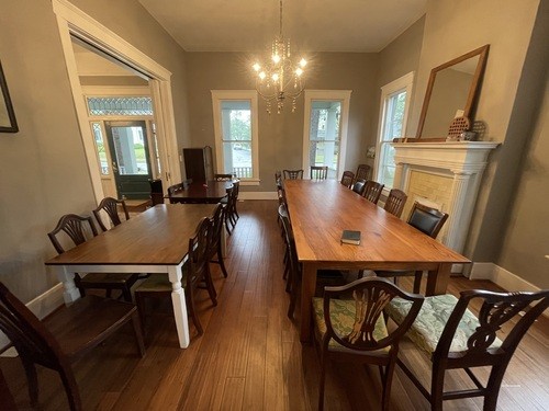 We announce the meal theme a few days before and each person brings what they can to serve the group, that includes food, drinks, desserts, and some volunteer to just come set up and take down the tables and chairs.
